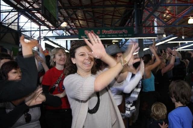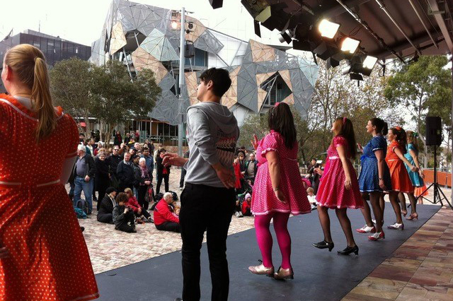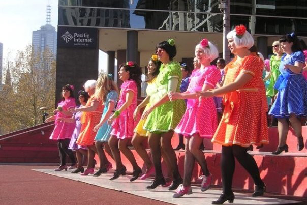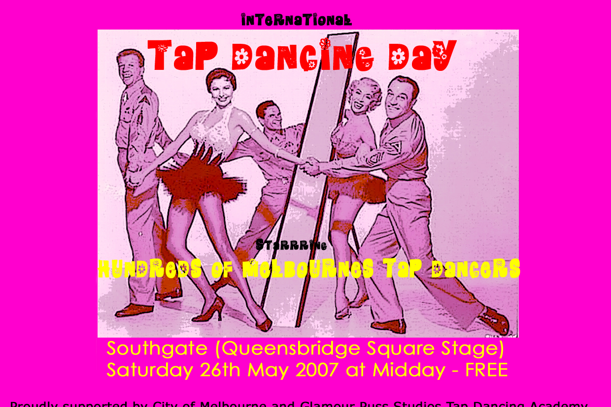 March o'Glamour from Victorian Arts Centre to Flinders Street Station. Shim Sham Shimmy on the steps of Flinders Street Station. on to Free Tap Performance at Federation Square with historical tap footage projected on the big screen.