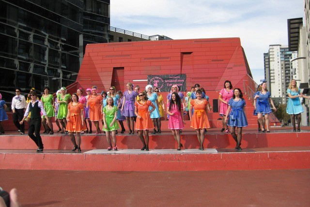 Tap Dancing March o'Glamour from Crown Casino to Evan Walker Bridge. Shim Sham Shimmy on Evan Walker Bridge. On to Free Tap Performance at Queensbridge Square on The Big Red Stage.