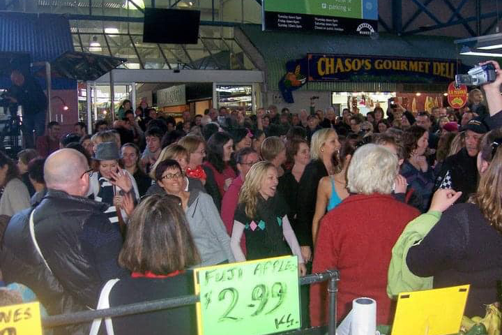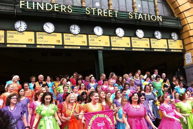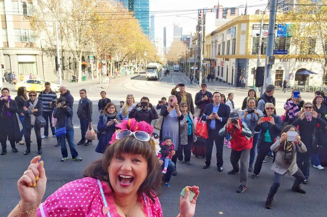 Tap Dancing March o'Glamour across Princes Bridge to Flinders Street Station. to Federation Square. Shim Sham Shimmy on the steps of Flinders street Station - on to Free Tap Performance at Federation Square with historical tap footage projected on the big screen.