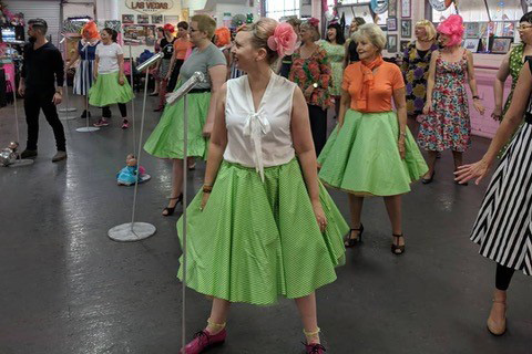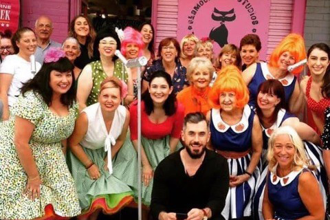 March o' Glamour from the St Kilda baths along The Esplanade to Luna Park. Shim Sham Shimmy at Luna Park. On to free tap performance at The Palais Theatre forecourt.